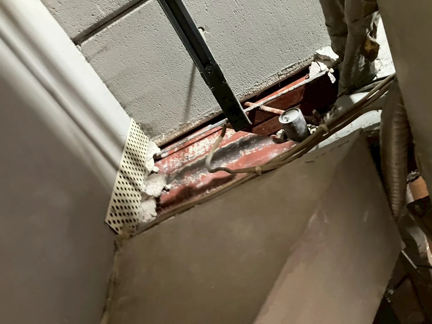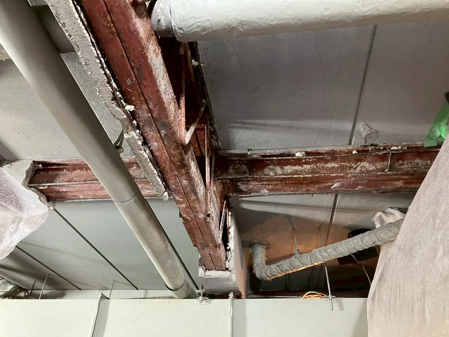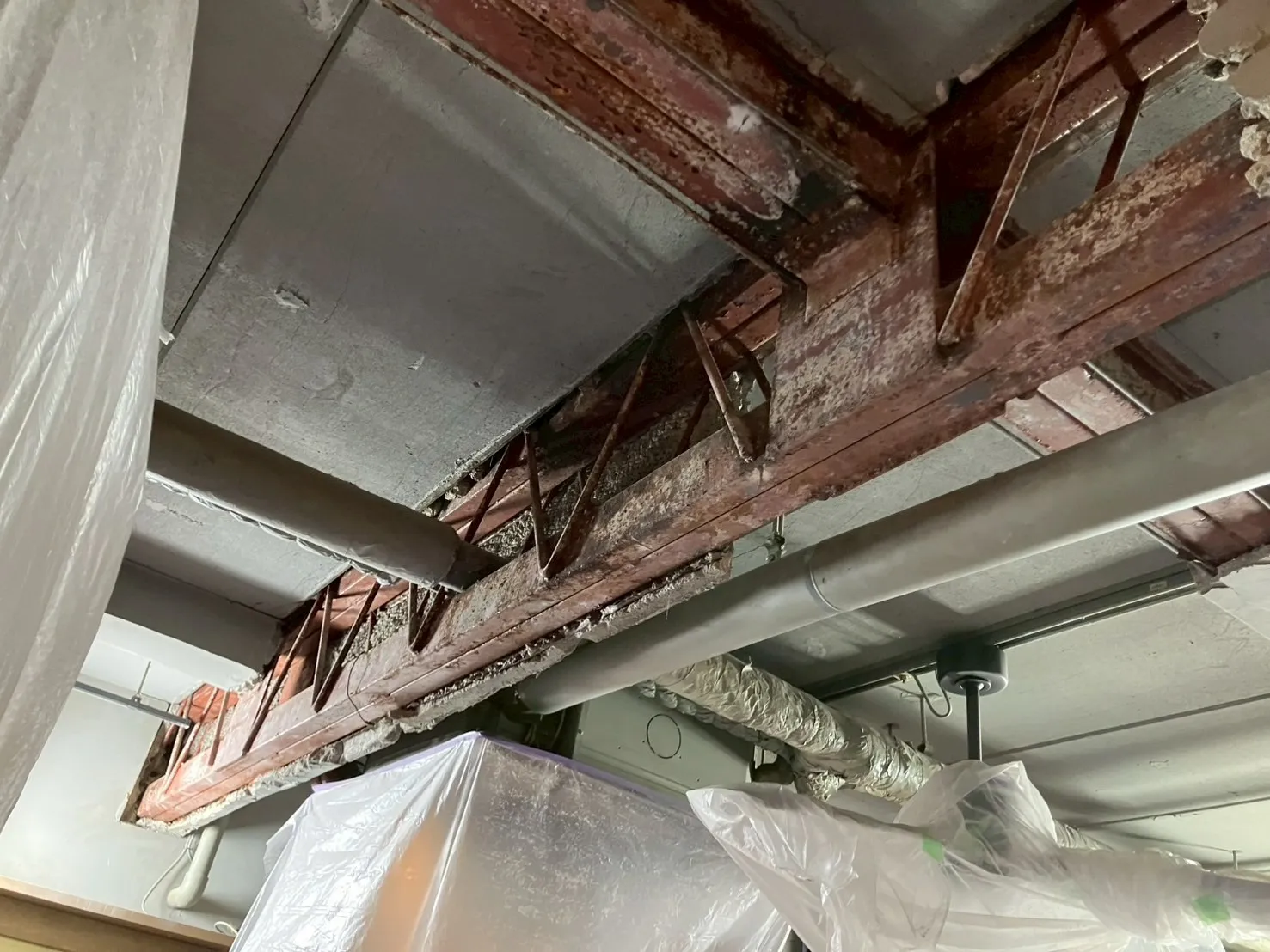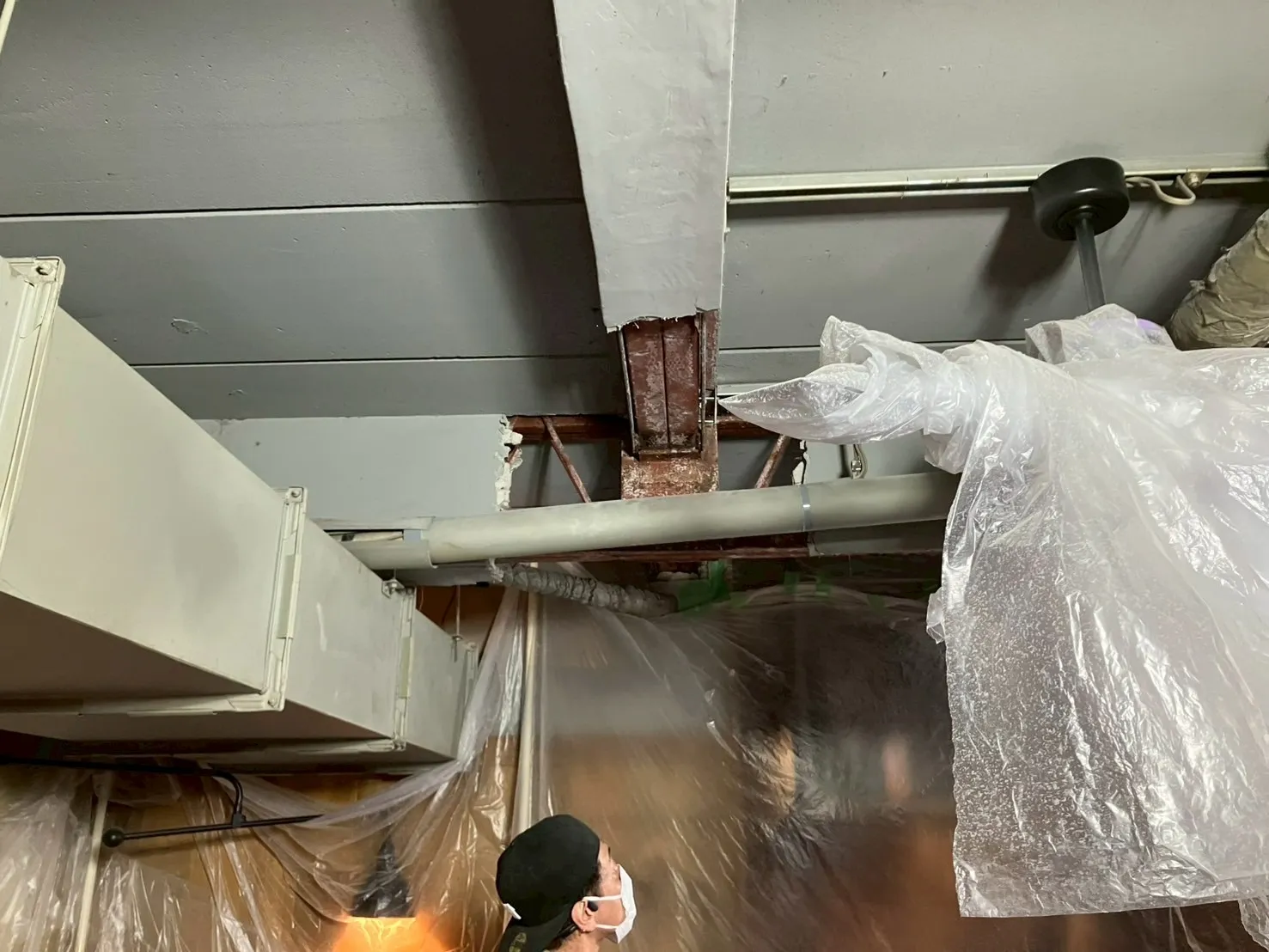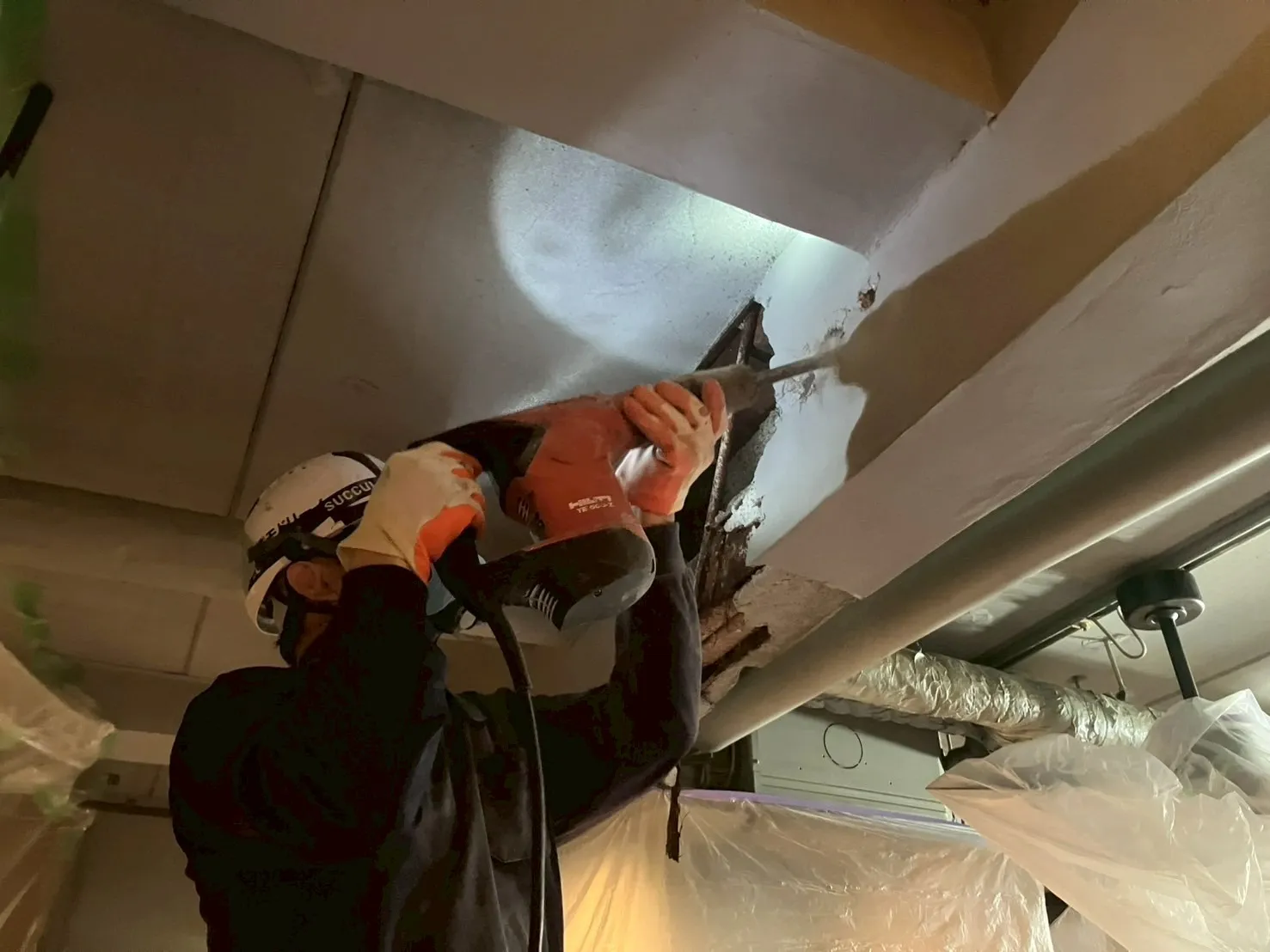 主な作業 :水漏れ箇所ハツリ撤去(剥落防止)、アスベスト事前調査、防塵養生