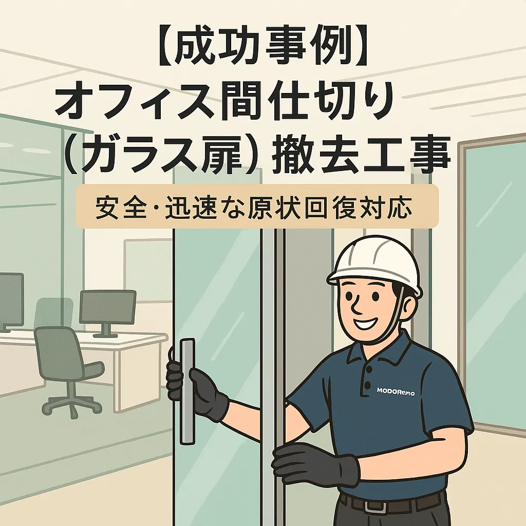 オフィス間仕切り(ガラス扉)撤去工事|安全・迅速な原状回復対応 今回は、名古屋市内のオフィスで実施した間仕切り(ガラス扉)撤去工事の事例をご紹介します。 「ガラスの撤去は危険ではないか」「工期や費用はどれくらいかかるのか」という不安をお持ちの方に参考にな…