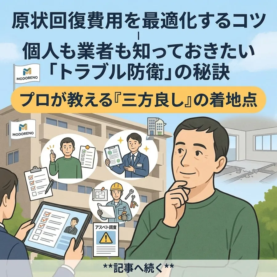 原状回復費用を最適化するコツ|個人も業者も知っておきたい「トラブル防衛」の秘訣 2026.3.13更新マンションの退去時に避けて通れない「原状回復」。しかし、その実態は「入居時の状態に完全に戻すこと」ではありません。「どこまでが負担範囲か?」「次の入居者のための修繕費を誰が持つ…