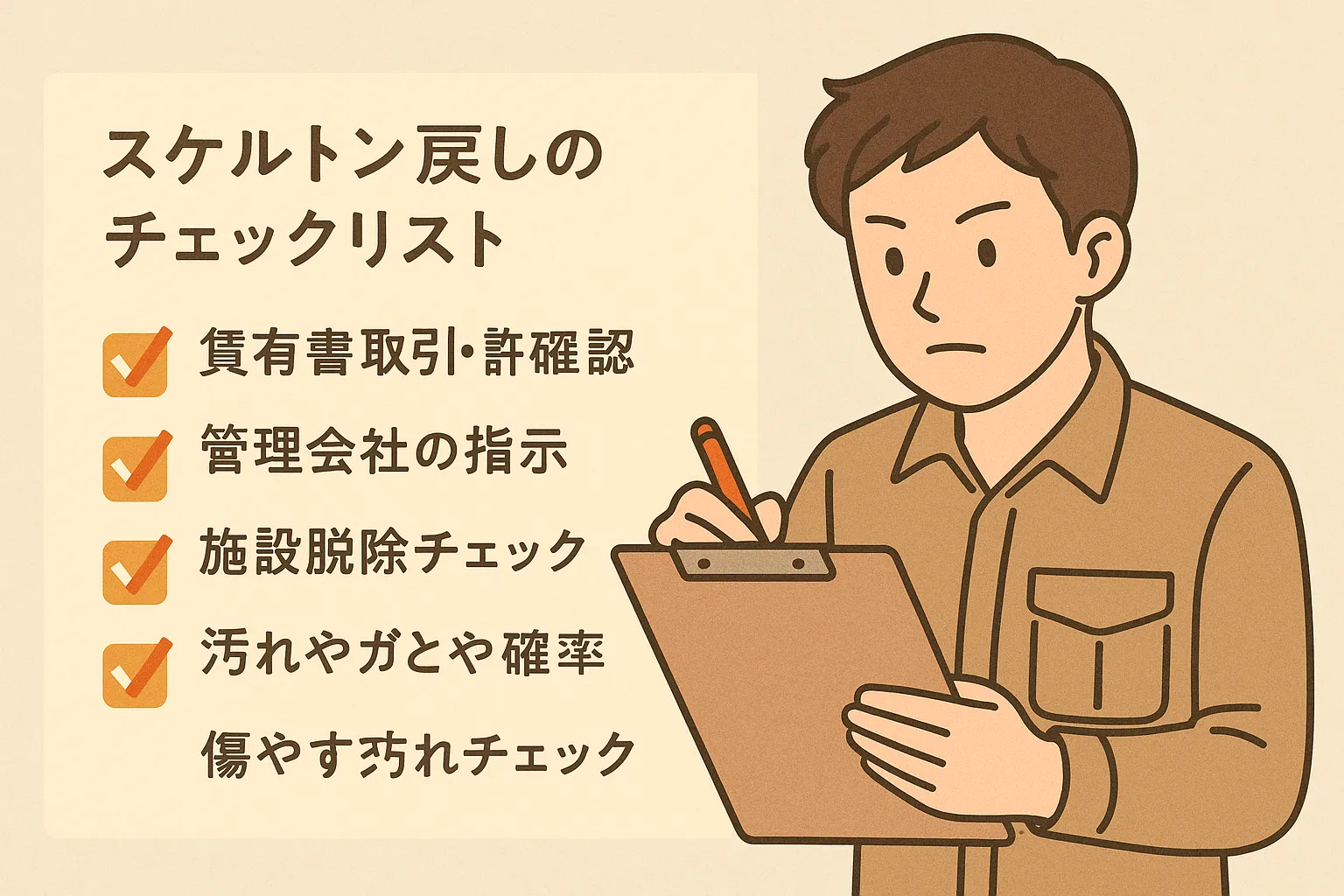 スケルトン戻しが必要?原形復旧工事のチェックリスト 原形復旧(原状回復)工事と聞いて、「スケルトン戻しが必要です」と言われたら、戸惑ってしまう方も多いのではないでしょうか? 特に賃貸オフィス・店舗・倉庫などの退去時には、工事の範囲や費用、契約…