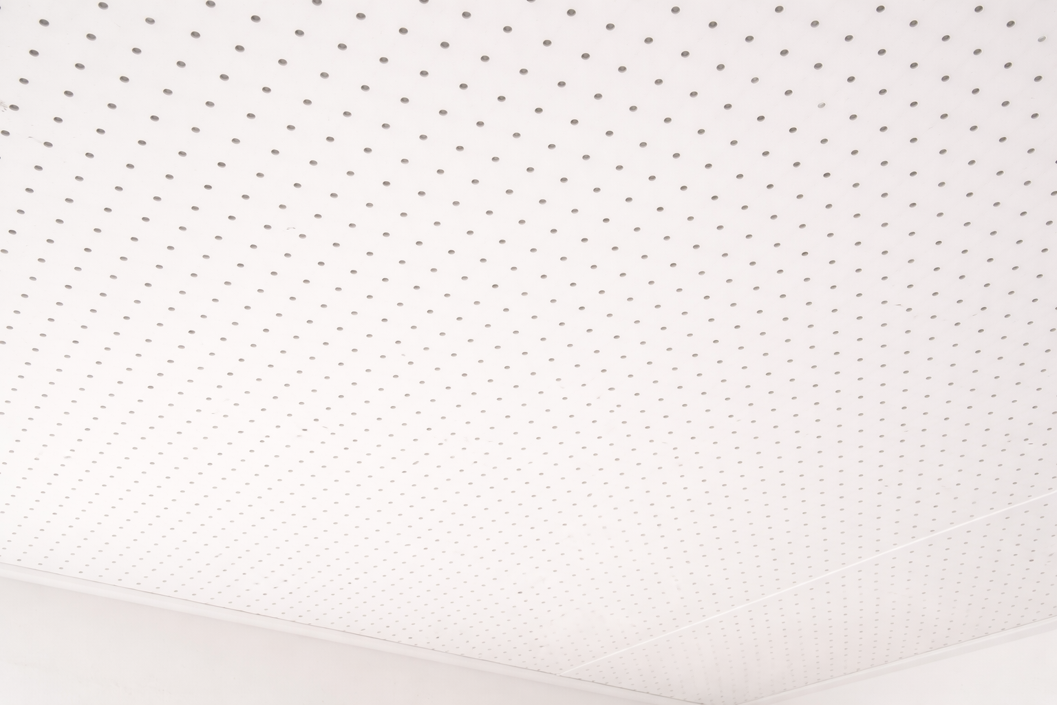 白っぽい穴あき板が石膏ボードではなく、有孔ケイカル板である可能性もあります。